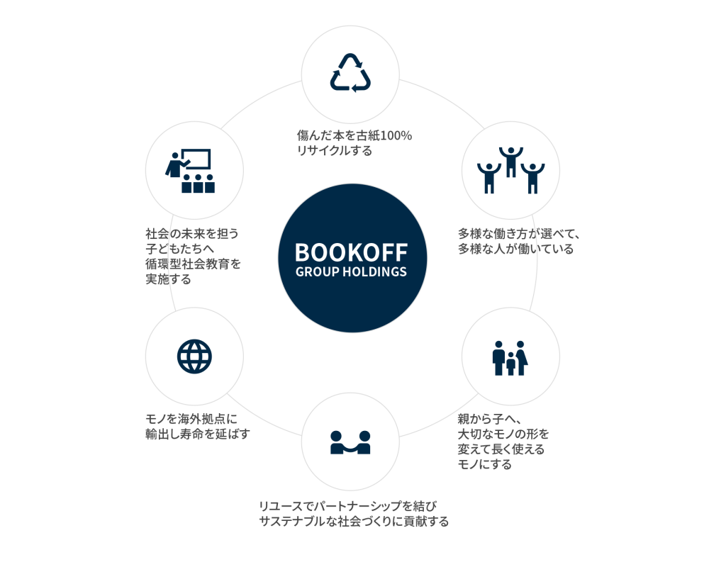 ブックオフグループは、ステークホルダーの皆様と共に社会的価値と経済的価値を創出し、社会と共に持続的な成長を続けていきます。