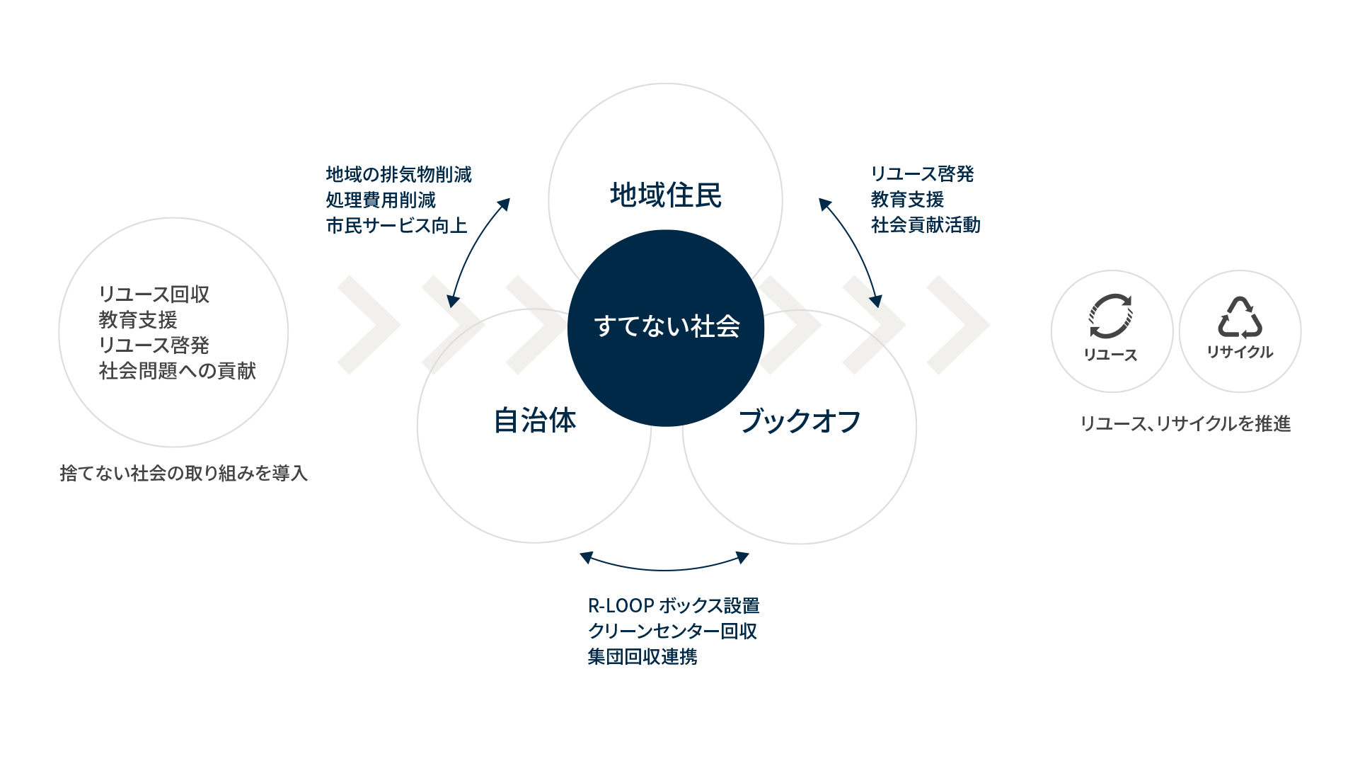 ブックオフの中核事業であるリユースビジネスは、循環型社会の一翼を担っています。地域のニーズにあった様々な取り組みをご提案し、持続可能な社会、社会問題の解決に貢献し、地域の皆様、自治体様と我々ブックオフで「すてない社会」を実現します。