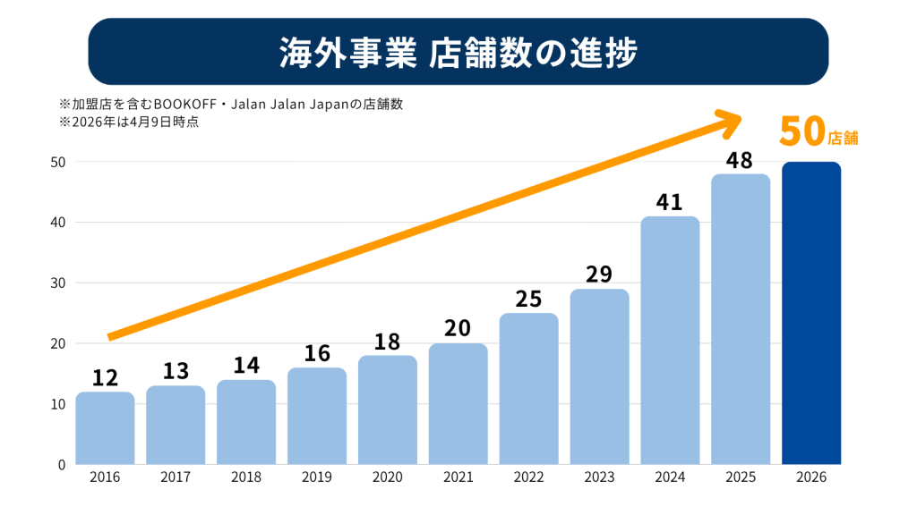 ブックオフグループホールディングス株式会社(本社:神奈川県相模原市、代表取締役社長:堀内 康隆、以下、ブックオフ)の海外グループ企業であるBOOKOFF U.S.A. INC.(代表取締役社長:平田 和也)は、アメリカ合衆国カリフォルニア州ロサンゼルス市に、現地にて買取・販売を行うリユース業態「BOOKOFF」の21店舗目となるWoodland Hills(ウッドランドヒルズ)店を現地時間の2026年4月9日(木)午前10時にオープンいたします。この出店により海外店舗数は50店舗を突破いたします。マレーシアなどにおいて日本から輸出した商品を販売するリユース業態Jalan Jalan Japan(ジャラン・ジャラン・ジャパン)事業立ち上げからの10年間で海外店舗数は4倍以上へと成長いたしました。コロナ禍の動画配信サービスの台頭などにより世界中でアニメ人気が加速したことが出店拡大の後押しとなっております。中期経営方針に基づき、海外事業では2033年にBOOKOFF事業で100店舗、Jalan Jalan Japan事業で100店舗の合計200店舗体制を目標に据え、今後も積極的に出店を進めてまいります。