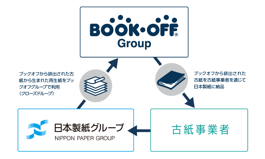 日本製紙株式会社と古紙の売買及び循環に関する契約を締結し、ブックオフグループから出た古本を日本製紙に直接納品することで国内リサイクル率100%を目指しています。