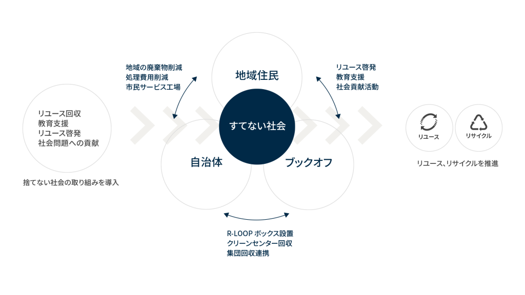 ブックオフの中核事業であるリユースビジネスは、循環型社会の一翼を担っています。地域のニーズにあった様々な取り組みをご提案し、持続可能な社会、社会問題の解決に貢献し、地域の皆様、自治体様と我々ブックオフで「すてない社会」を実現します。