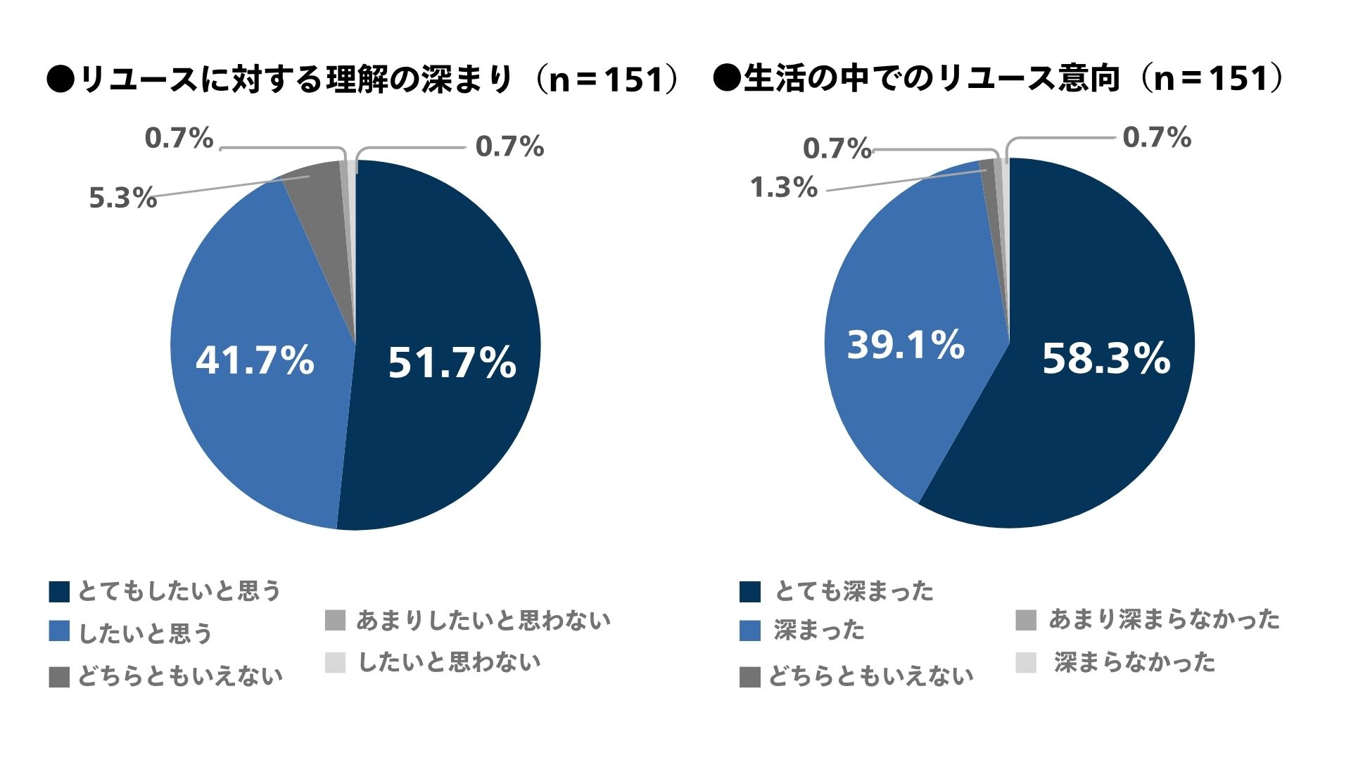 2025年にリユース企業6社合同で開催した体験イベントの初回は、環境省の後援とリユース企業6をはじめシェアリングエコノミーやアップサイクルに取り組む26社からの賛同を受けて実施。2日間でお子さま259名、保護者の方も含め555名が来場し、リユースに対する理解を深め日常生活でも取り組む一歩となりました。昨年来場者に実施したアンケートでは、イベントへの参加を通じ「リユースの理解が深まった」が93.4%、「生活の中でもリユースをしたいと思った」が97.4%となり、環境問題を自分ごとに捉え、日常でリユースに取り組むきっかけを創出。実施以降、多数の企業から参画の要望とイベント参加者から次回開催を期待する声をいただいたことから、前年同様に実行委員会を設立し第2回目の開催で継続的に生活者のリユースの認識を深める機会を創出いたします。